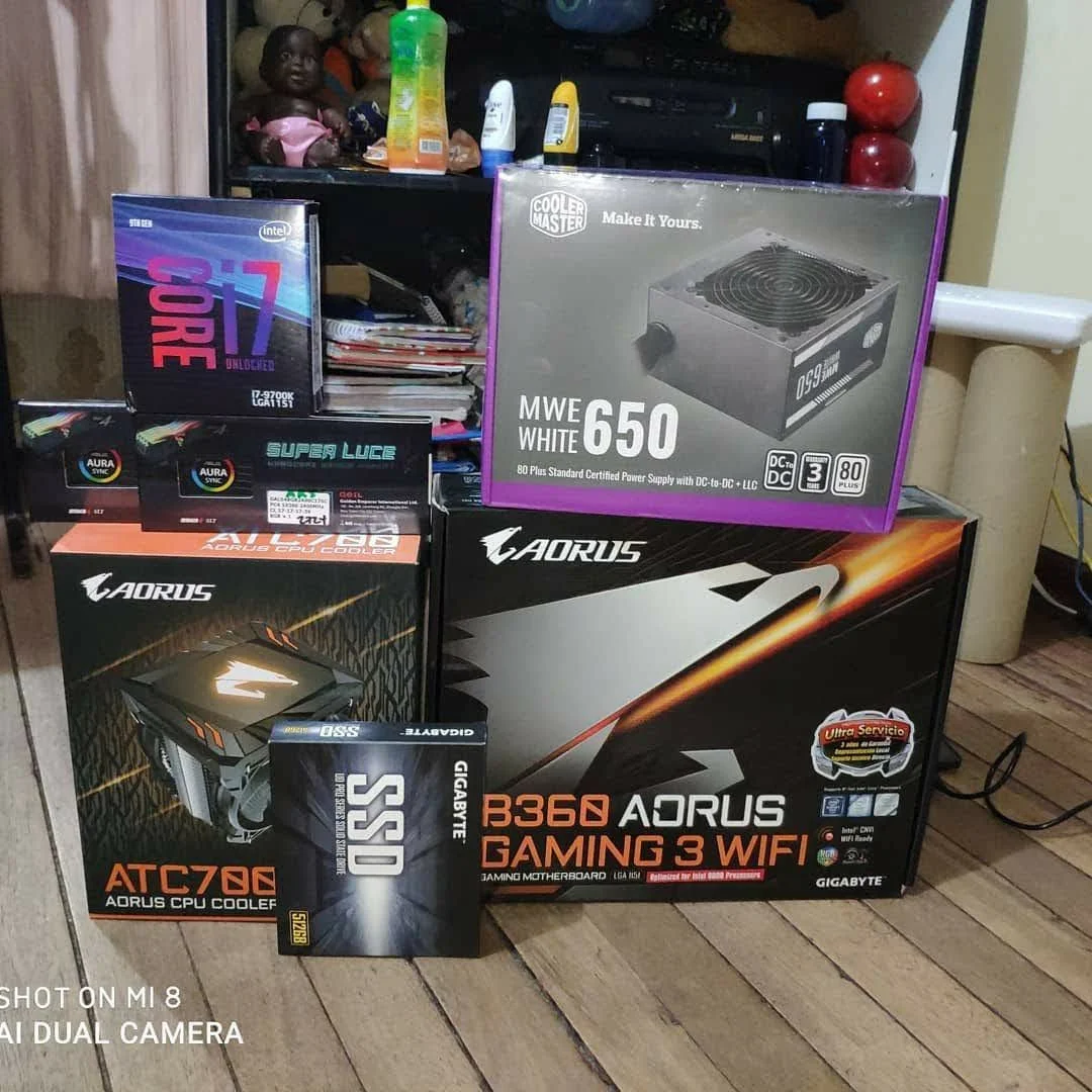 Poco a poco fui comprando cosa por cosa hasta el 1 de febrero de 2020 que mi mamá me prestó el dinero que me faltaba para comprar las demás partes al menos para que pudiese encender y trabajar sin problemas. Después de un día de caminar y buscar casi por cada local de Unilago (Plaza tecnológica de Bogotá, Colombia) precios bajos, al fin tenía casi todo lo que me faltaba para completar el PC entre ellos lo más caro y más deseado por mí de todos los componentes el i7-9700K una bestia parda que incluso Enero de 2023 a fecha de actualizar esta información sigue siendo una bestia absoluta, en ese momento lo único que me faltaba era el Case (Gabinete o mal llamada CPU) pero así lo usé hasta Julio de 2020.